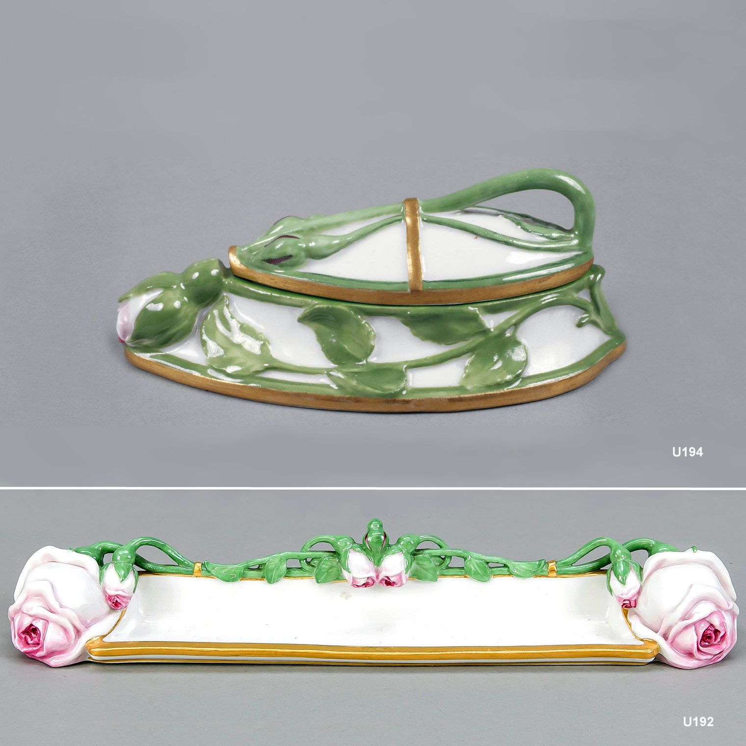 Meissen hat pin tray and a box with roses from a toilet service for a ladies room, designed by Heinrich Vogeler in 1905 for his later wife Martha.
