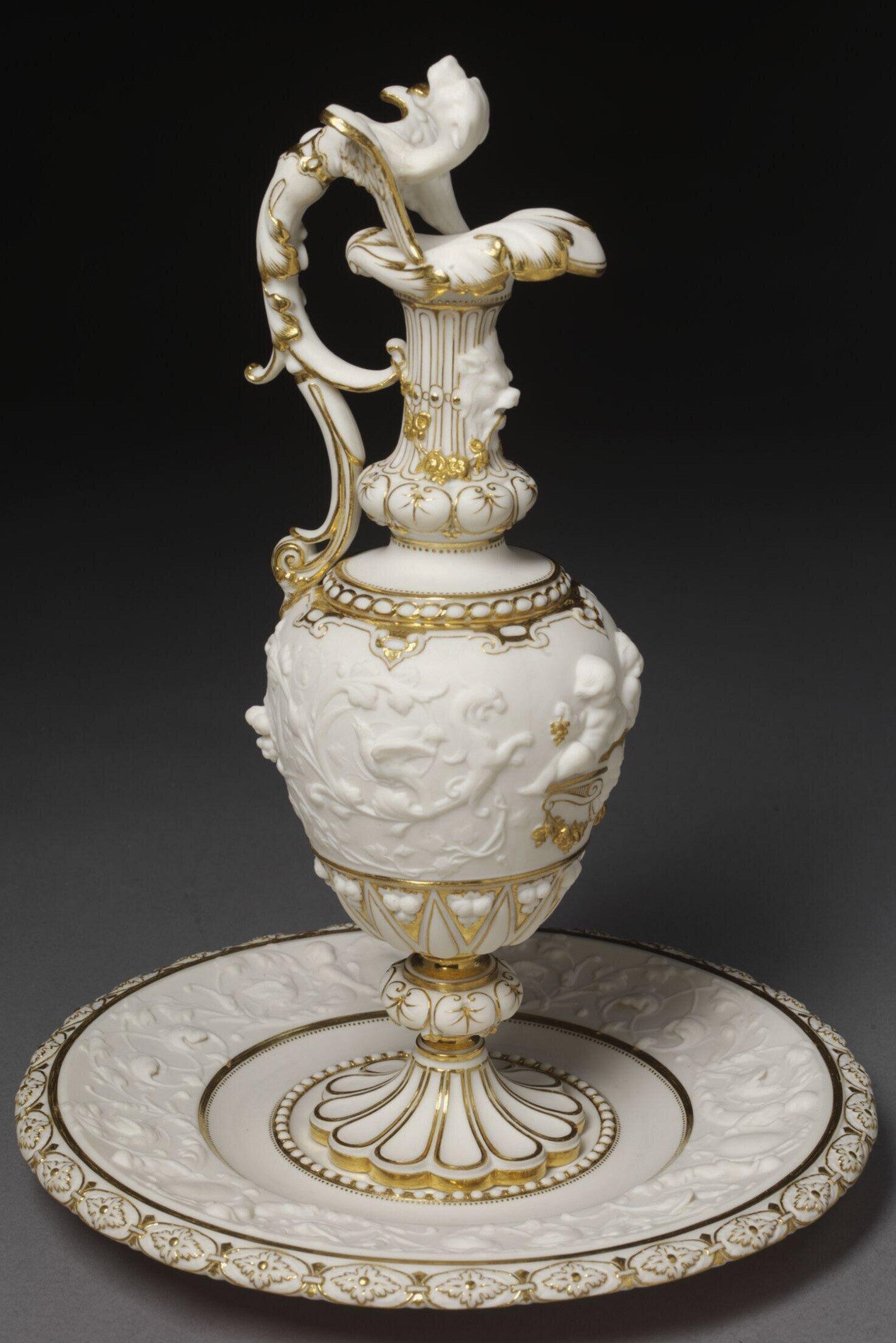 Ovoid body decorated on the front with two nude figures of boys reclining on a double bracket between two monsters, terminating in symmetrical scrolled stems with foliage, amongst which are birds. The neck is gadrooned and has a lion’s mask on the front. The mouth has a foliated edge and projecting lip. The handle is in the form of a winged monster. The foot is scalloped and has a knob on the stem. The rim of the circular stand is decorated with three shields supported by pairs of demi-figures of cupids terminating in symmetrical leafy scrolls amongst which are birds; the edge is moulded with quatrefoils.