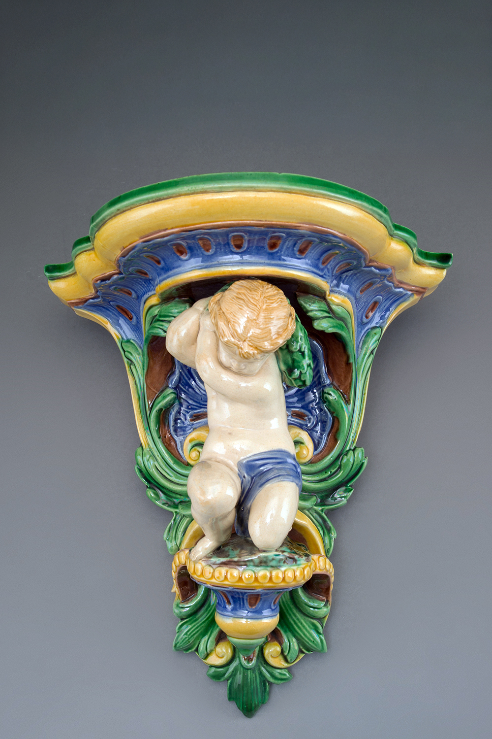 Minton 824 Majolica Cupid Wall Bracket Shape Number: 824 Height: 12″ (30 cm). The shape drawing is from The Minton Archive.