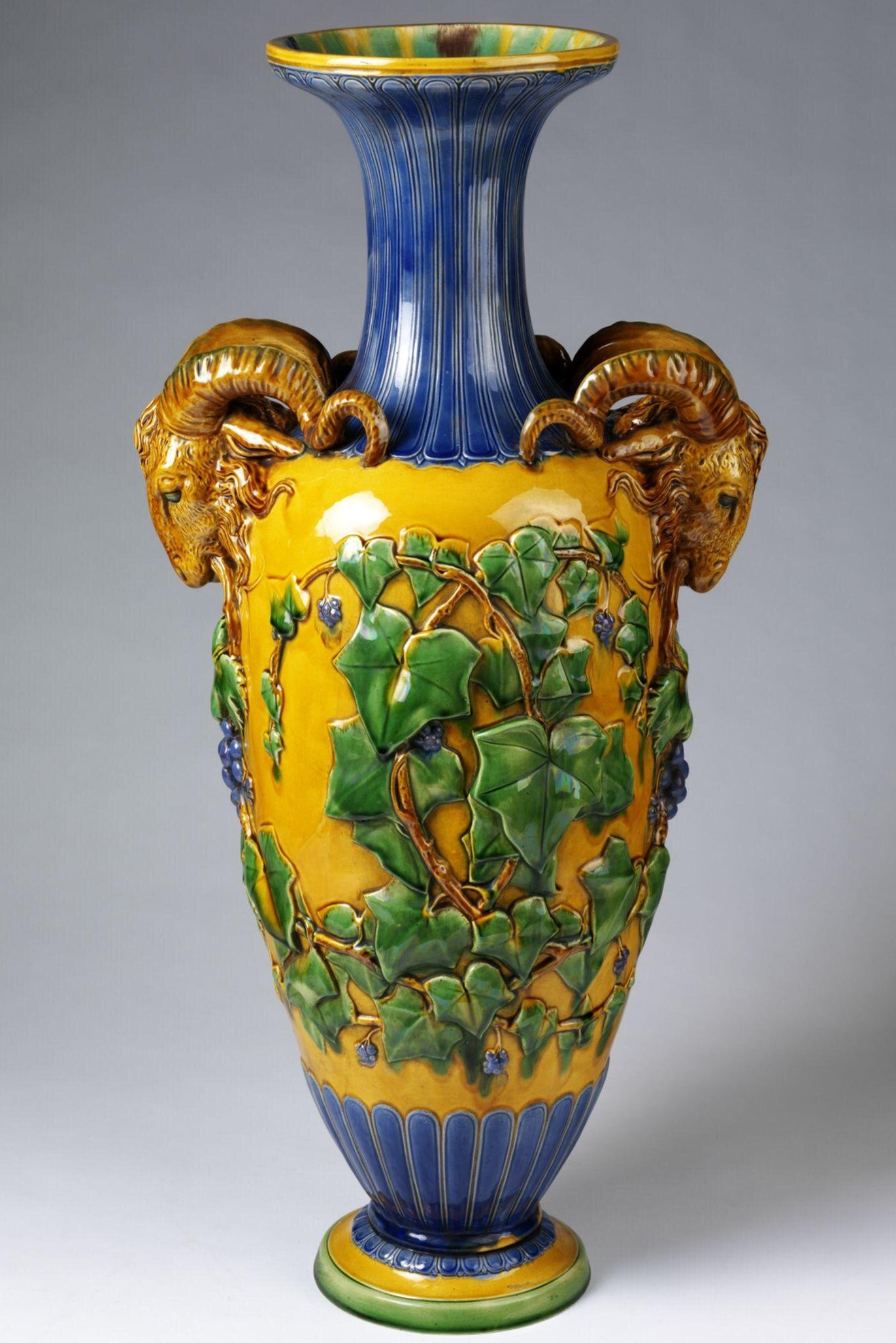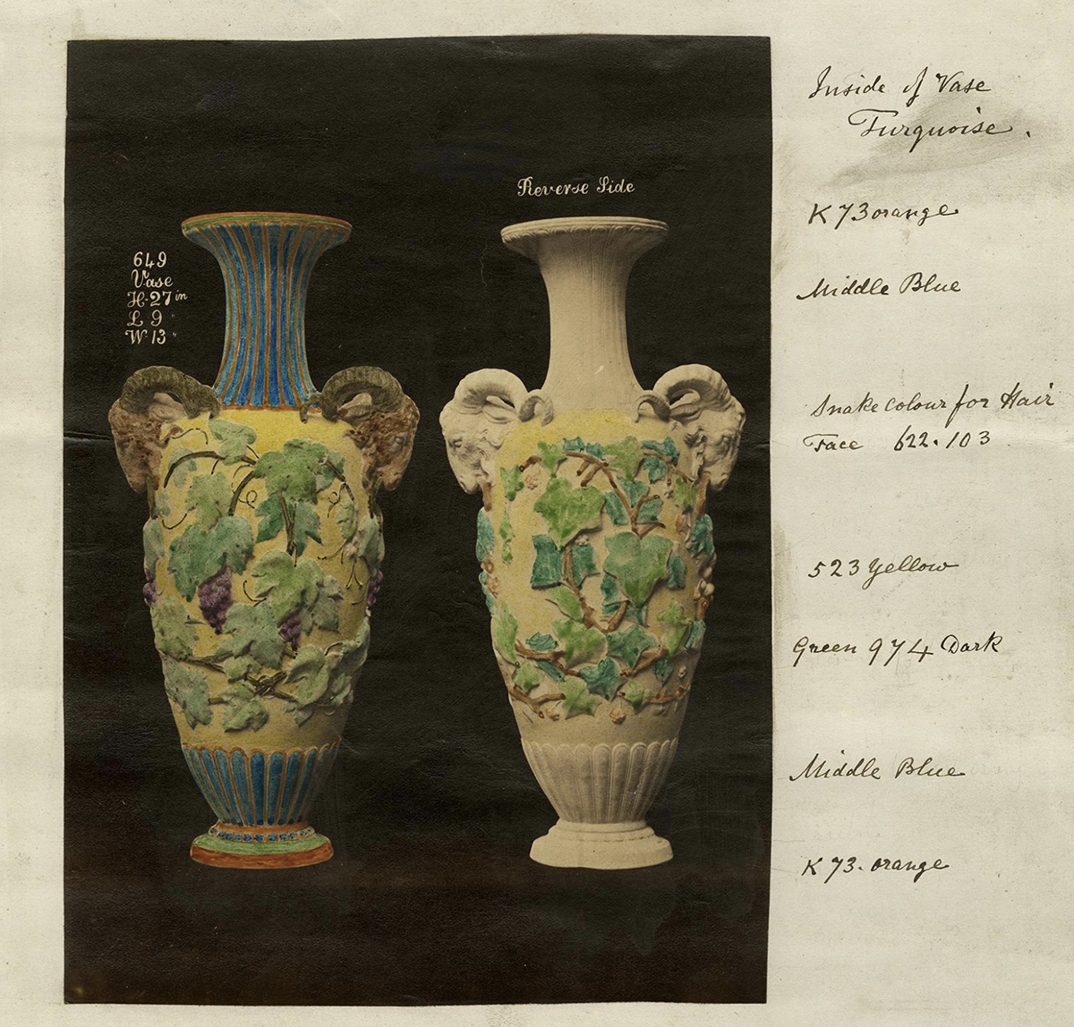 Minton 649 Majolica Vase with Ram’s Head Handles Shape Number: 649 Height: 71 cm Vase of enamelled earthenware in imitation of Palissy ware. With ram’s head handles, and with vine and ivy branches in relief. Designed by Elijah Chetwynd Shape sketch from The Minton Archive.