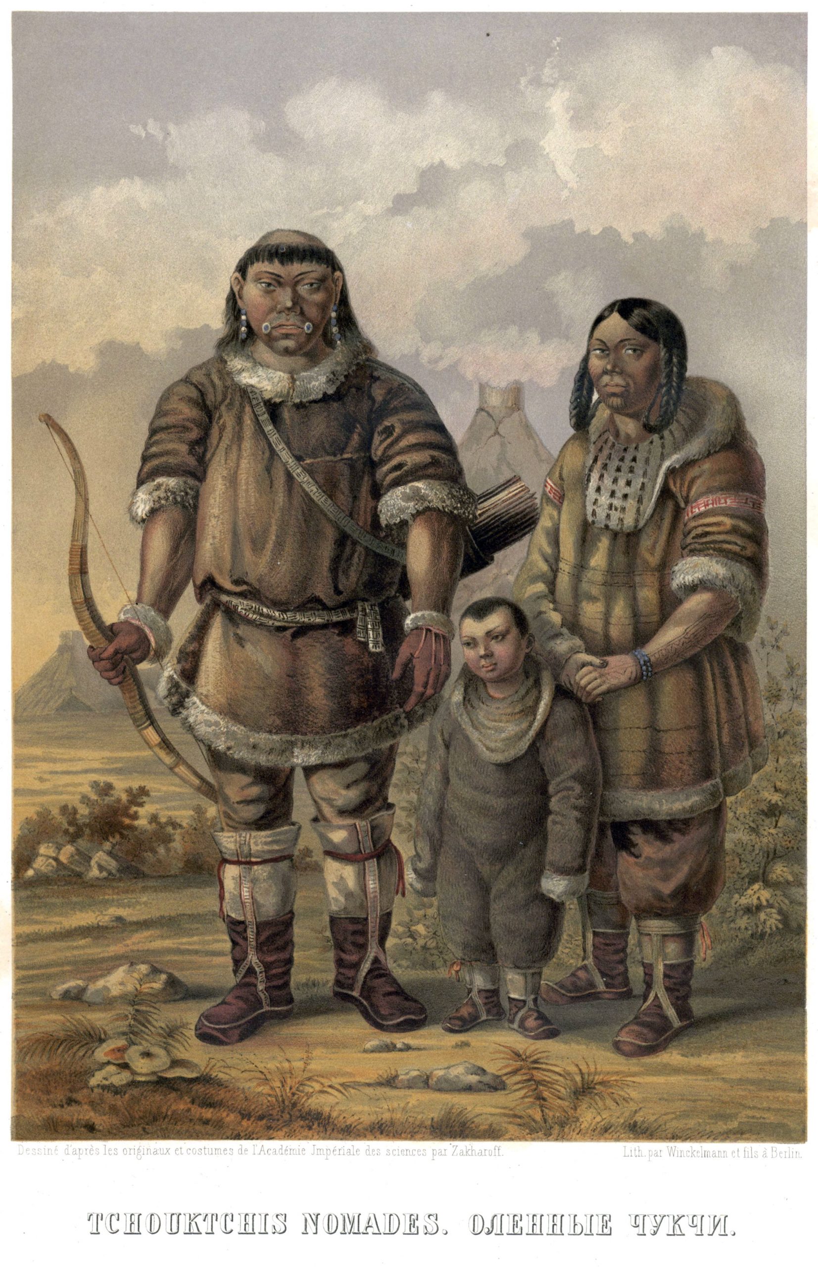 По гравюре из книги “Description ethnographique des peuples de la Russie” (Ethnographic description of the peoples of Russia), a two-volume work published in Saint Petersburg in 1862 to mark the millennium of the founding of the Russian Empire (traditionally traced to the founding of the state of Kievan Rus’ in 862). The work is dedicated to Tsar Alexander II. Volume 1 consists of 62 colored illustrations depicting ethnic groups from across the Russian Empire in their traditional dress. The captions identifying the groups are given in French and Russian. This volume also includes a fold-out table listing the different ethnic groups and the size of their populations in the cities in the empire, as well as a colored-coded ethnographic map that shows which groups inhabited which parts of the empire. Volume 2 is all text, and consists of detailed essays, in French, about the ethnic groups of the empire–their history, culture, language, and so forth–which reflect the state of anthropological and historical knowledge of the 1860s. The book is the work of Gustav-Fedor Pauli (1817-67), a German ethnographer who immigrated to Russia. Pauli’s work was the seminal publication on the ethnic groups that made up the Russian Empire. Pauli also documented the eastward movement of ethnic Russians from European Russia into the Urals and southern Siberia. He was a member of the Imperial Russian Geographical Society and a founding member of the Russian Society for the Protection of Animals. Presented here is one of the illustrations from volume 1 of Description ethnographique des peuples de la Russie.