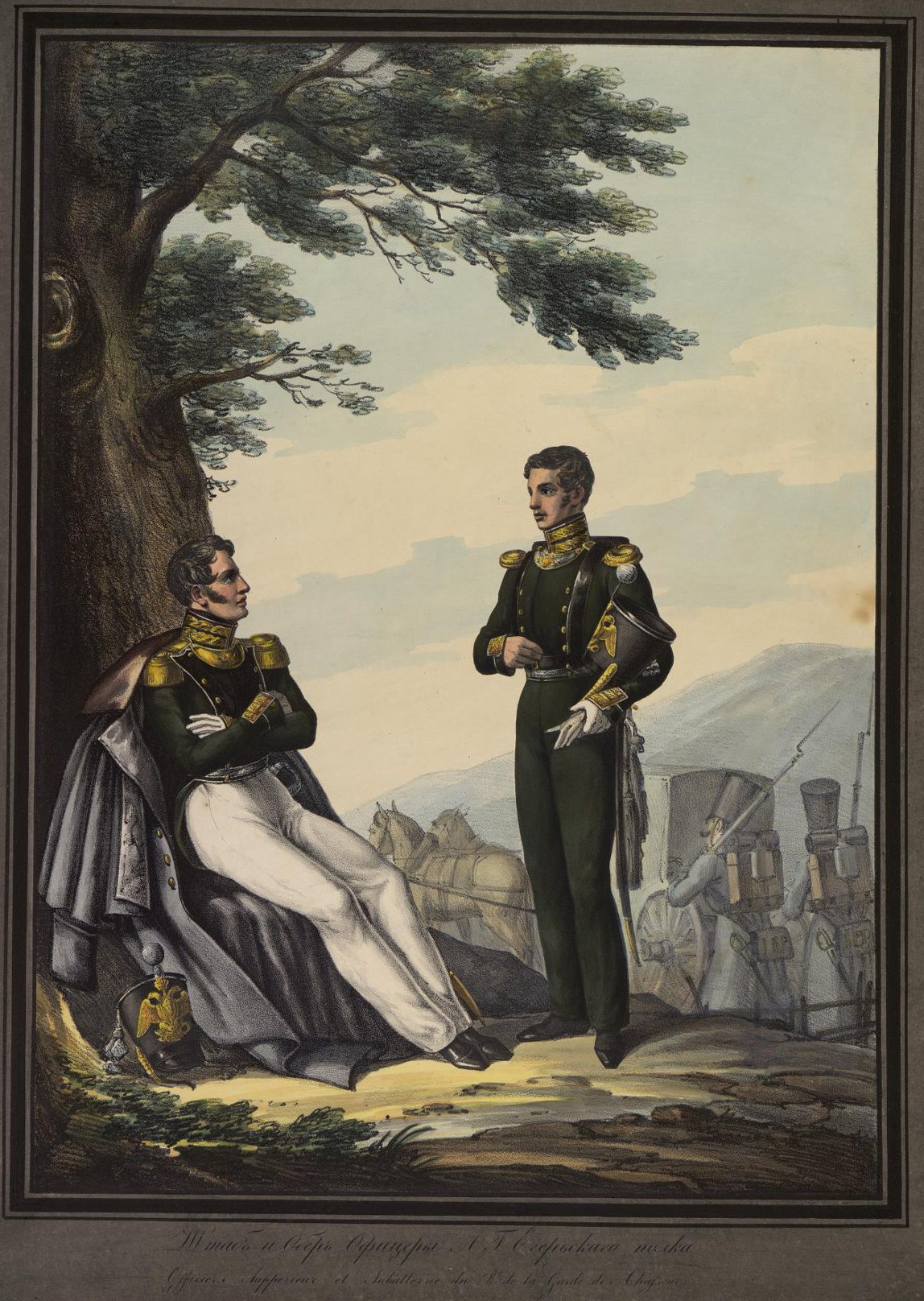 Военная тарелка ИФЗ золотой серии “Штаб и Обер-Офицеры Л.Г. Егерьского полка” 1832 Штаб и Обер-Офицеры Л.Г. Егерьского полка Signed and dated on the back ‘N. Kornilov. 1832′ Литография Белоусова по рисункy Александра Зауервейда и Саймойло Шифляра.