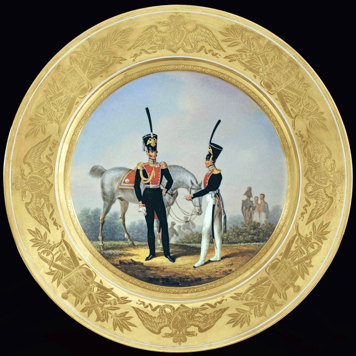 Начиная с 1830 г, офицеры на этом сюжете изображены в “новых” более высоких киверах без кутас, и как следствие, у тарелки другой дизайн борта.
