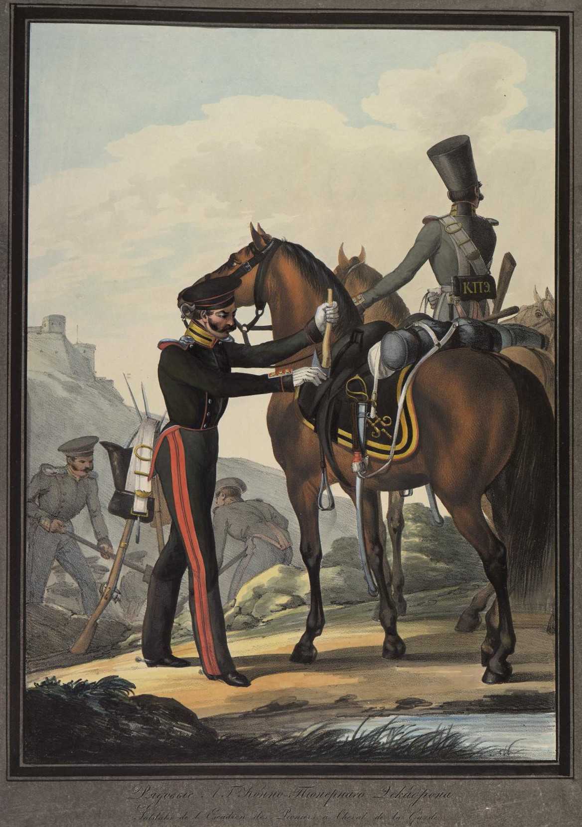 Russian Imperial Porcelain military plate depicting soldiers of Life-Guard Pioneer Squadron “Рядовые Л.Г. Конно-Пионерного Эскадрона”. Императорский фарфоровый завод. Circa 1830. C литографии Белоусова по рисунку Александра Зауервейдa.