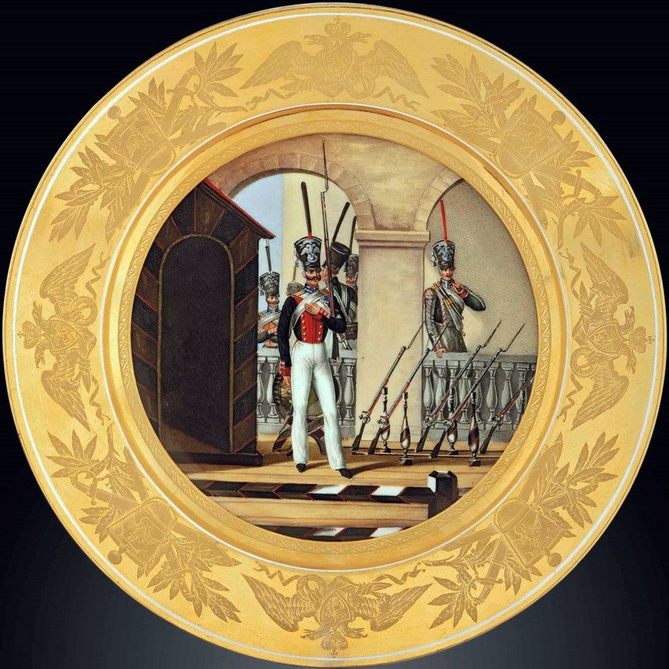 Russian Imperial Porcelain military plate depicting soldiers of Emperor of Austria Life-Guard Grenadier Regiment Emperor of Austria Life-Guard Grenadier Regiment (Гренадерский Императора Австрийского полк) более известен как Кексгольмский лейб-гвардии полк. После побед над Наполеоном назван в честь союзного императора Австрии. Не следует путать с гренадерским полком Австрийской армии. Данный полк – гренадёрская пехотная гвардейская часть Русской армии, и просто был назван в честь Австрийского императора. По литография Льва Белоусова (рис. Александра Зауервейда и Саймойло Шифляра) “Рядовой Гренадерского Императора Австрийского полка”.