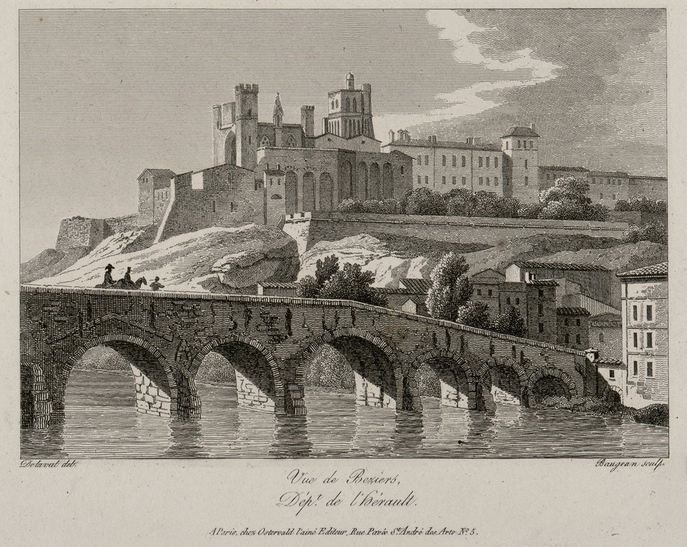 View of Béziers, one of the oldest cities in France, featuring the Pont Vieux (Old Bridge) and the Saint-Nazaire Cathedral on top of the hill.
